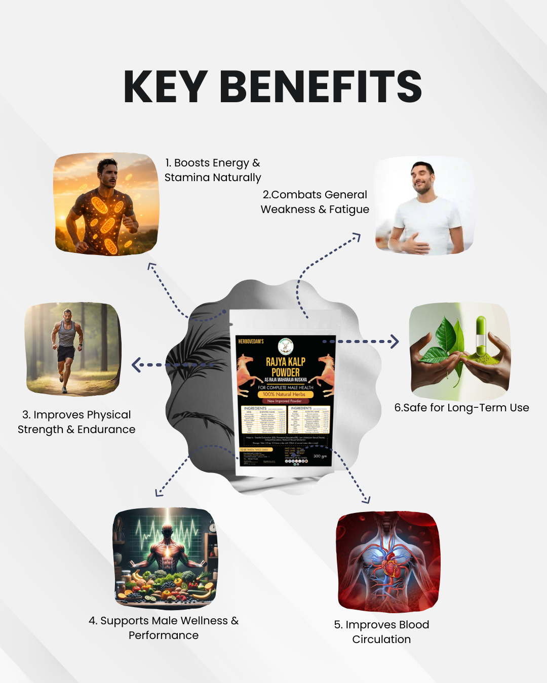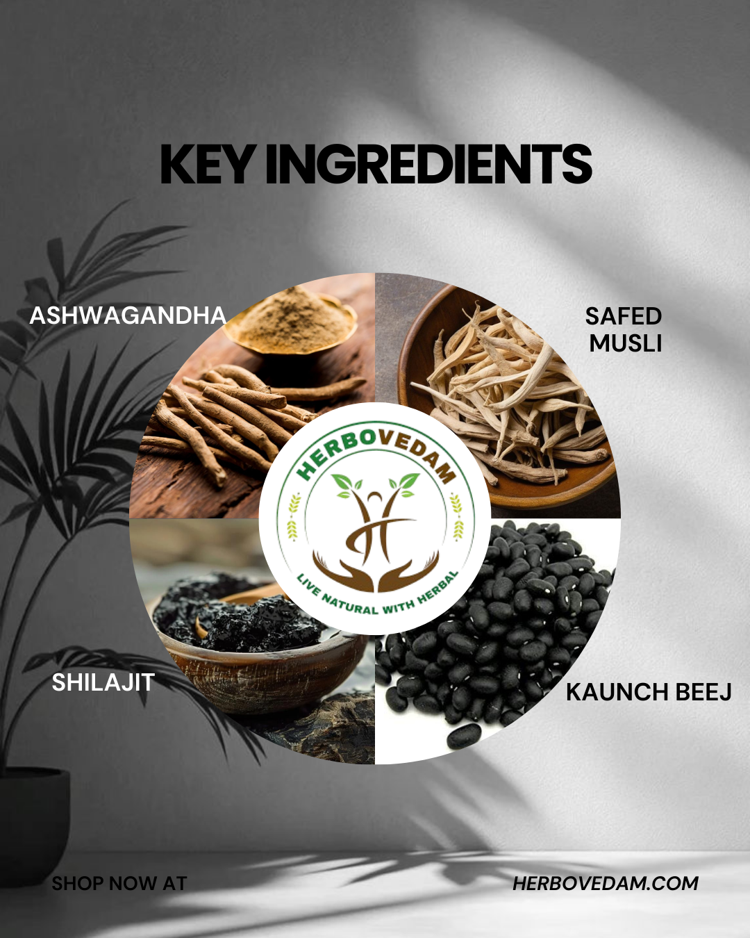 Enriched with potent herbs like Ashwagandha, Safed Musli, Shilajit, Kaunch Beej, Gokshura, and Shatavari, this blend works holistically to boost energy levels, reduce weakness, and promote hormonal balance.